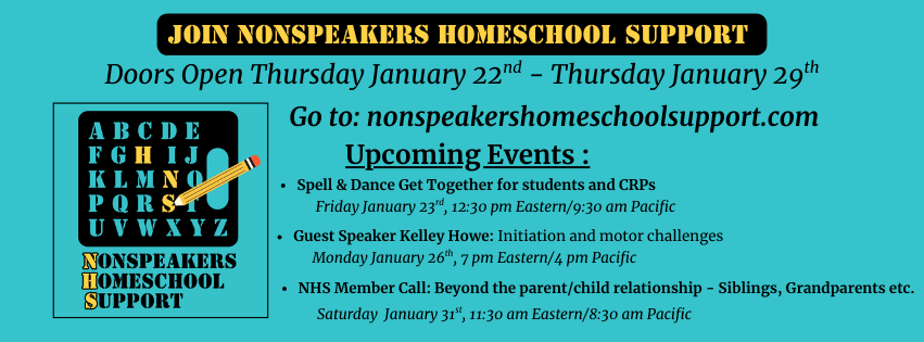 NHS is geared to helping families with a nonspeaking, unreliably speaking or minimally speaking member. There are unique challenges to homeschooling and life in our families. However, we know that there are many others who struggle with apraxia and speech challenges who are not autistic, such as individuals with Down Syndrome, cerebral palsy or other disabilities. We welcome anyone who feels NHS is a good fit for their family.